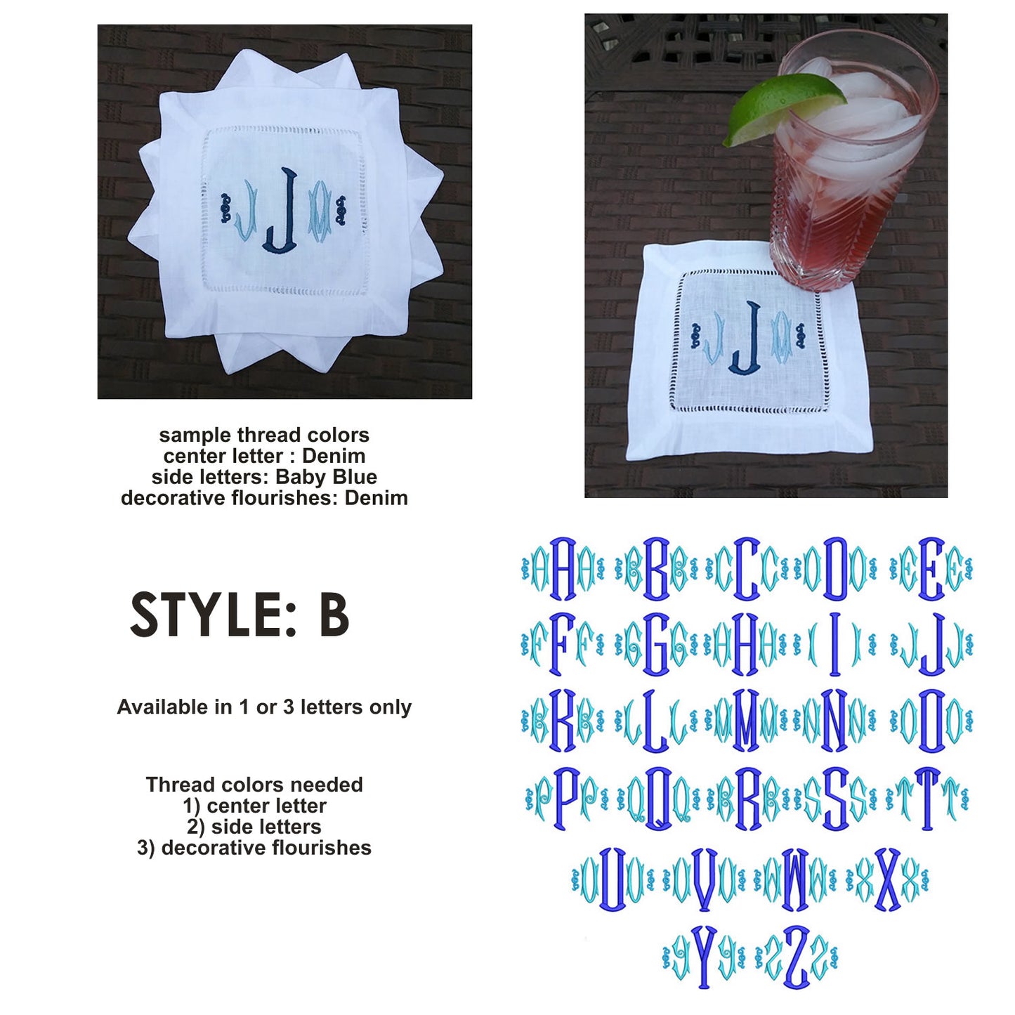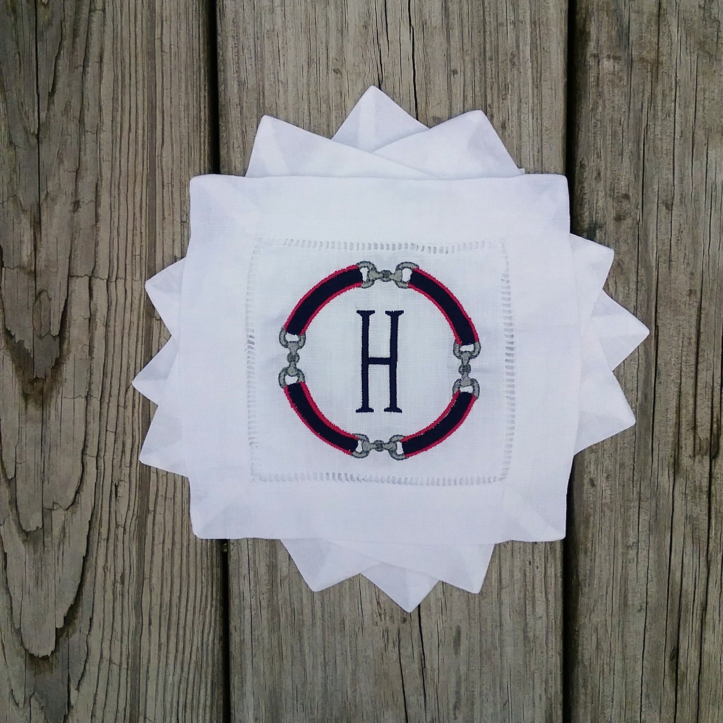 Linen Monogrammed Cocktail Napkins, Embroidered Cocktail Napkin, Personalized Linen Cocktail Napkin : Our 6 inch square white linen cocktail napkins are embroidered with the monogram or letter of your choice. Purchase napkins individually and design each one the way you'd like, or, you can order a set of 4 identical napkins at a discounted rate, all with free shipping! See photos for font styles