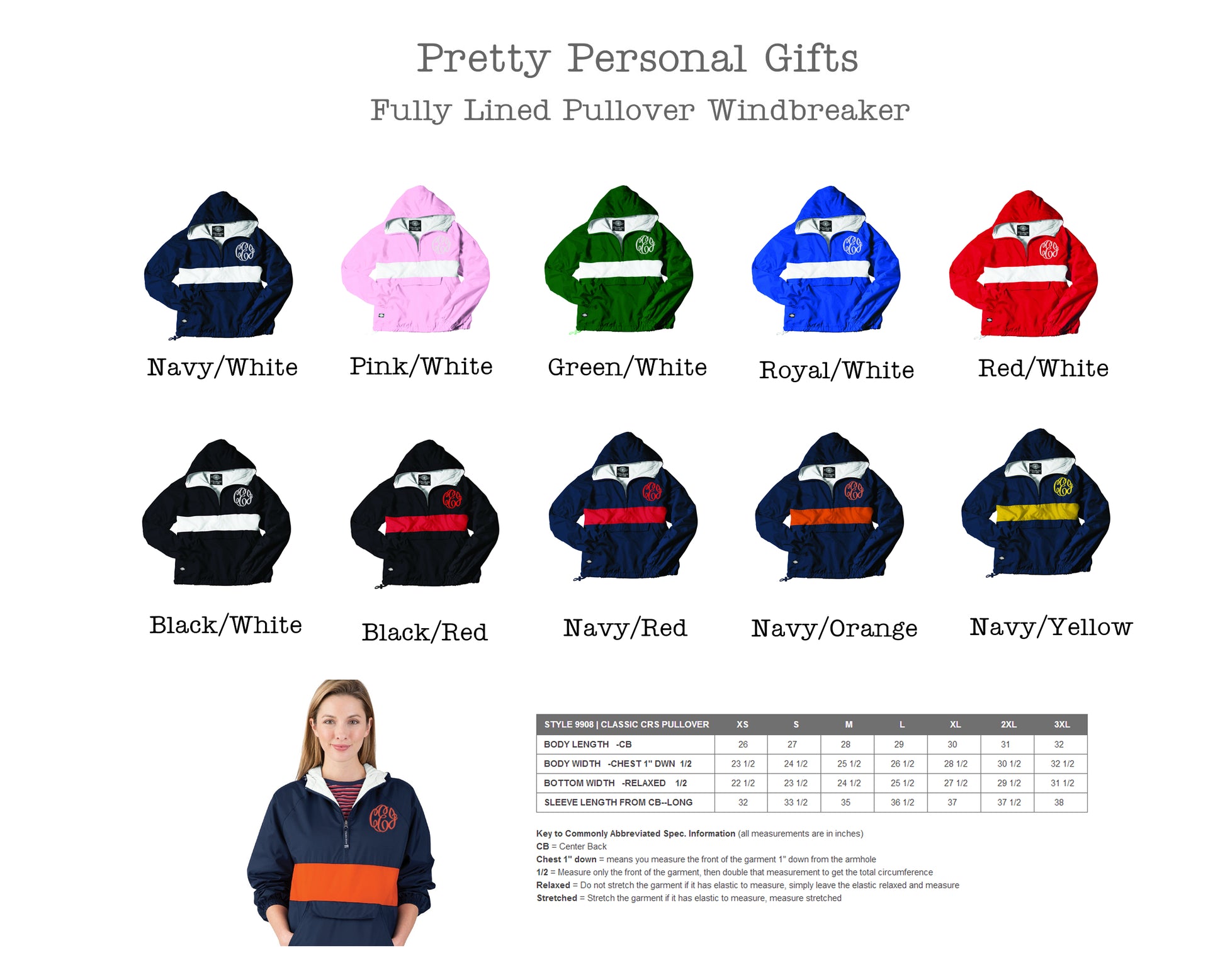 Charles River Apparel Flannel lined windbreaker pullover stripe jacket available in 12 colors unisex size for men and women, this wind & water resistant this pull over stripe wind breaker is available in 12 colors. Your wind breaker is fully lined with cozy white flannel and can be monogrammed on chest, hood or both in the thread color of your choice.