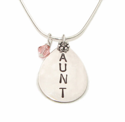 This sterling silver tear drop shaped MOM necklace is not engraved, it's hand stamped and distressed for a very contemporary look. As such the alignment of each letter is not exact which adds to the hand crafted appeal of each piece. Each charm is custom made to order. Add a birthstone dangle or pearl dangle to make this more personal. Choose from MOM, AUNT, NANA and MIMI