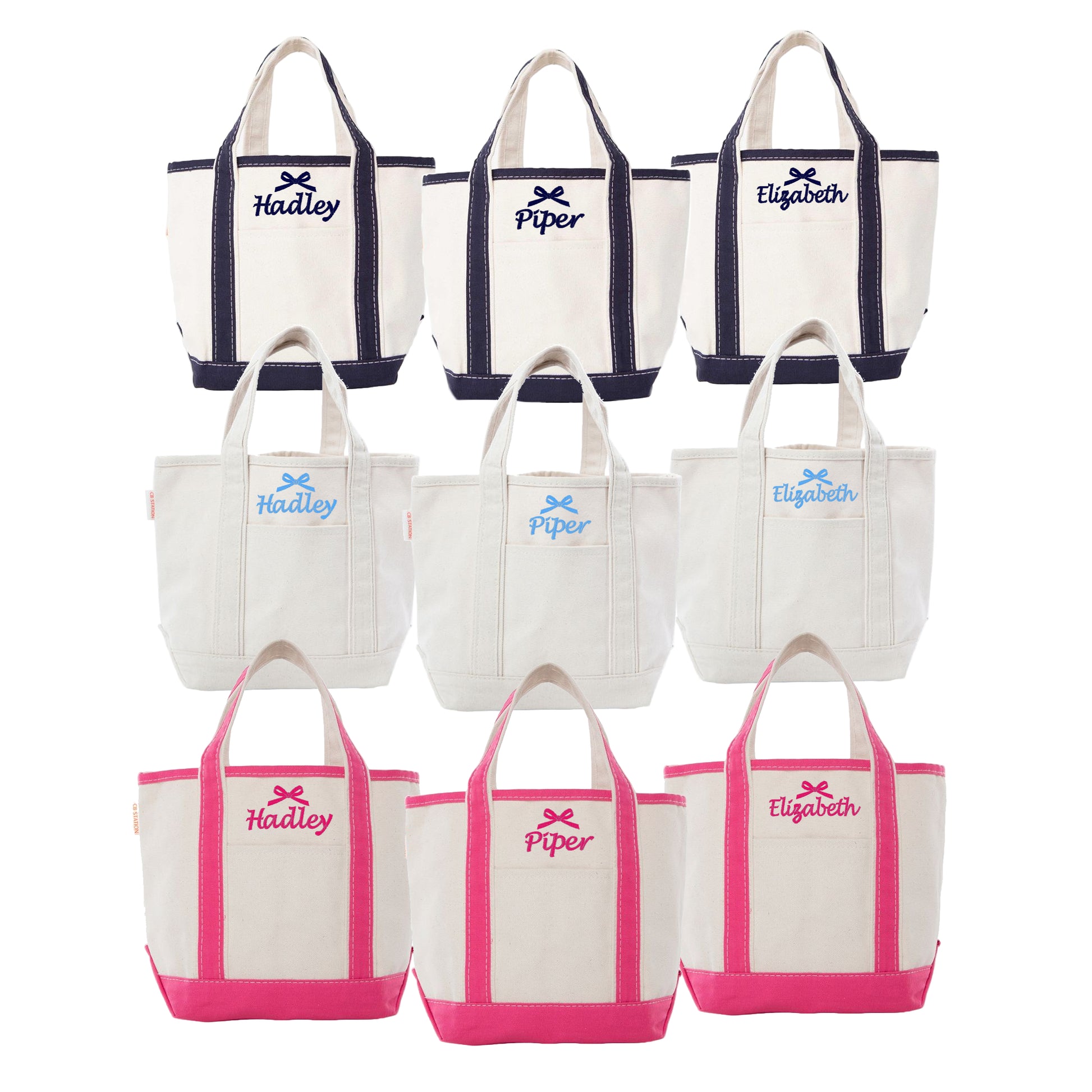 Personalized Mini Canvas Tote Bag: This personalize mini canvas tote bag offers both style and function, making it an exceptional gift. Each mini canvas tote is expertly embroidered with a name above the pocket. The accent bow is optional and can be embroidered above the name. Refer to the charts in this photos for the full selection of colors and font styles. This is an open top tote with no zipper. This mini tote is a favorite for bachelorette parties, bridesmaids proposals, wedding party proposals, party gift bags and bags for kids.
