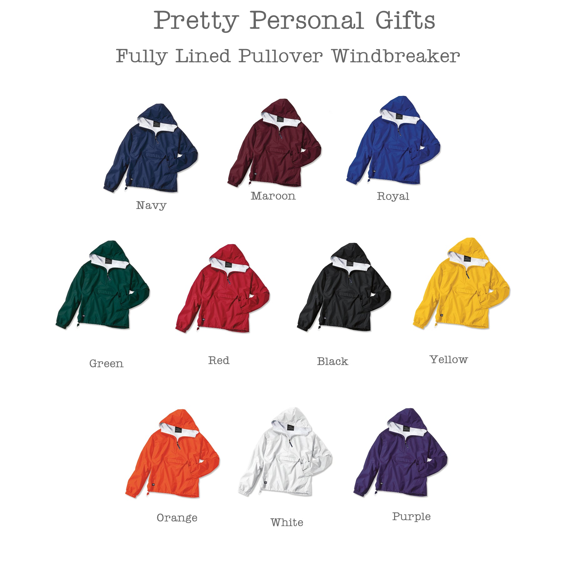 Charles River Apparel Flannel lined windbreaker pullover jacket available in 10 colors unisex size for men and women - Wind & water resistant this pull over wind breaker is available in 10 colors. Your wind breaker is fully lined with cozy white flannel and can be monogrammed on chest, hood or both in the thread color of your choice.